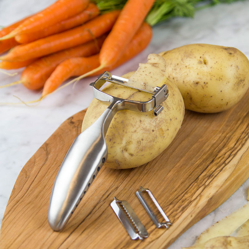 Den stilfulde skræller i rustfrit stål fra Global klarer alle skrælleopgaver, og den kommer desuden med 3 udskiftelige blade, hvilket gør den endnu mere alsidig.
