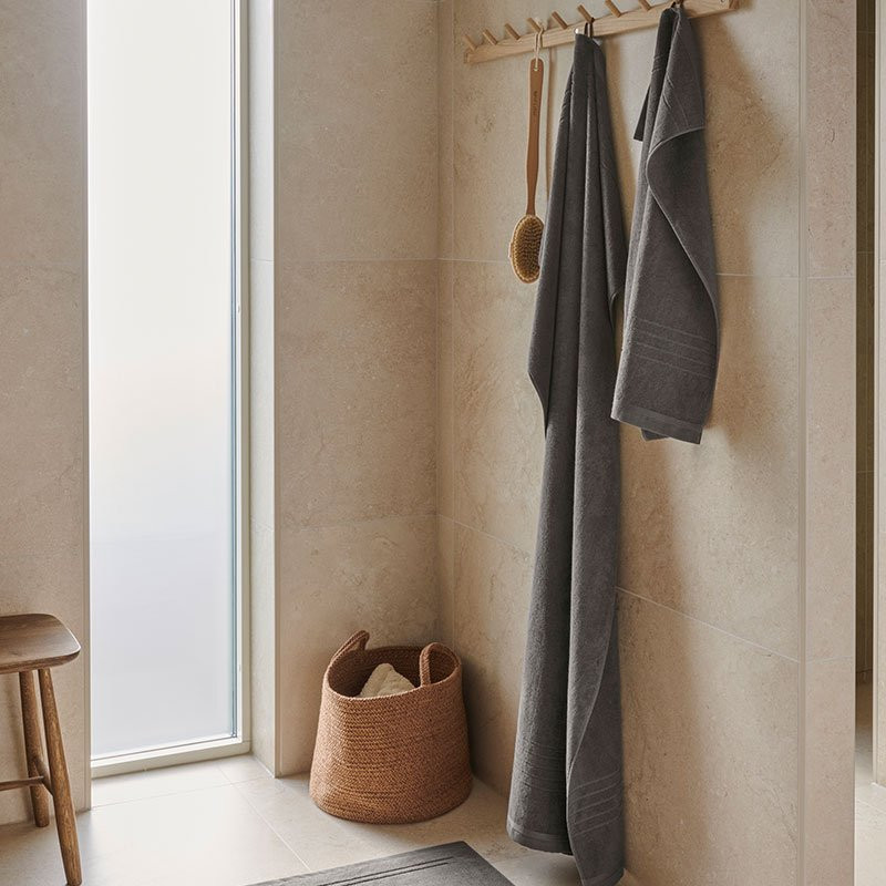 Borganäs Helle frotté er en serie håndklær, badelaken og dusjmatter i stilig og moderne design som passer på de fleste bad. Frottéen er laget av 100% bomull i en myk og behagelig kvalitet. Badehåndklær i størrelse 90x150 cm har tre kanter øverst og fem nederst, samt avrundede oppheng på begge kortsider for enkel oppheng.